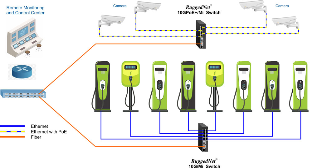 - Serves as the central hub with two 10Gigabit fiber uplink and eight Gigabit copper ports to connect EV charging stations.
