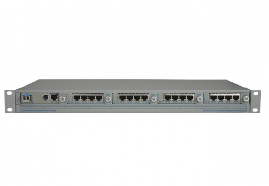 The iConverter 5-Module Chassis is designed for Enterprise Local Area Network (LAN) and Metropolitan Area Network (MAN) applications where fault tolerance and reliability are essential. The 1U (1.75 inch) high iConverter 5-Module Chassis has redundant power supplies and can be mounted in a 19-inch or 23-inch rack.