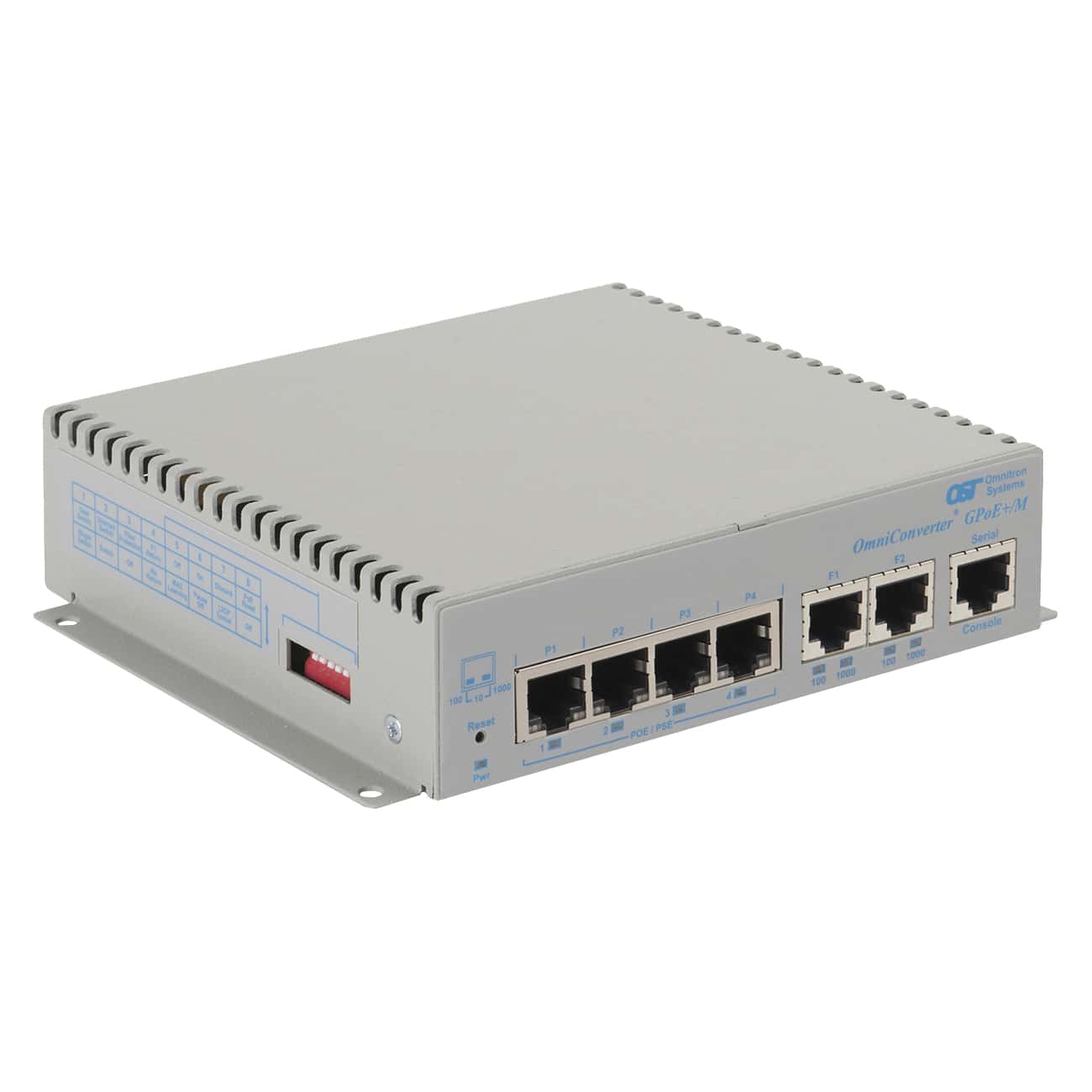 OmniConverter® GPoE+/M: 4 x 10/100/1Gbps RJ-45 PoE+ 30W to 2 x 10/100/1Gbps, RJ-45, No fiber, 100m, Managed Ethernet Switch, Standalone/Wall-Mount, US 100-240VAC, Commercial/Enterprise Temperature Range