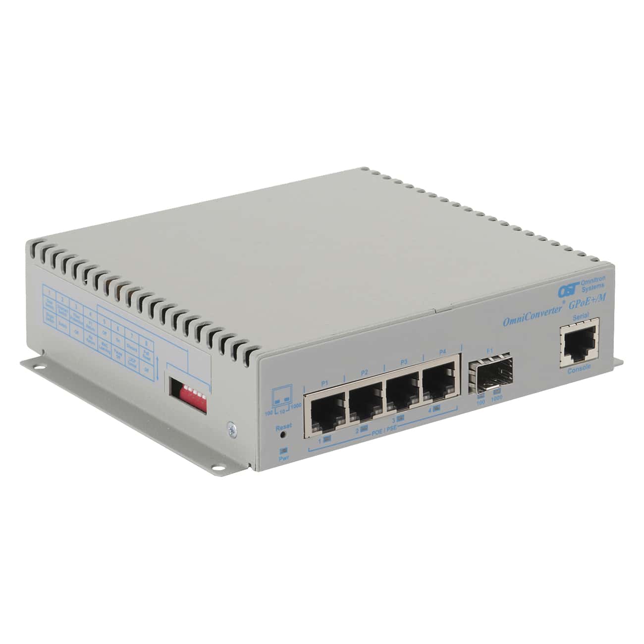 OmniConverter® GPoE+/M: 4 x 10/100/1Gbps RJ-45 PoE+ 30W to 1 x 1 Gbps, SFP, Fiber type depends on SFP, SFP-Dependent, Distance depends on SFP, Managed Ethernet Switch, Standalone/Wall-Mount, DC 2-Pin Terminal, Extended Temperature Range