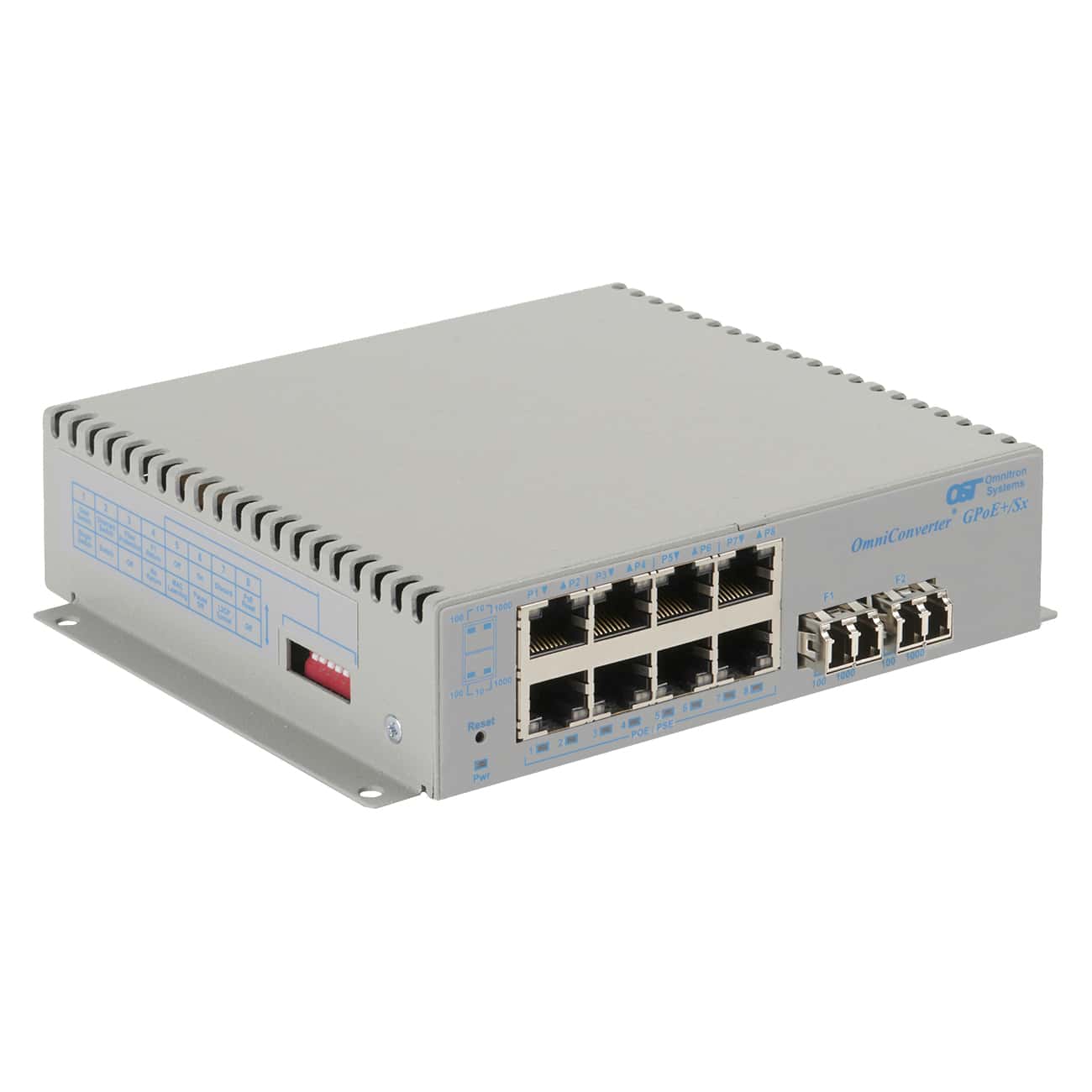 OmniConverter® GPoE+/SX: 8 x 10/100/1Gbps RJ-45 PoE+ 30W to 2 x 1 Gbps, LC, SMDF, 1310, 12km, Unmanaged Ethernet Switch, Standalone/Wall-Mount, DC 2-Pin Terminal, Commercial/Enterprise Temperature Range