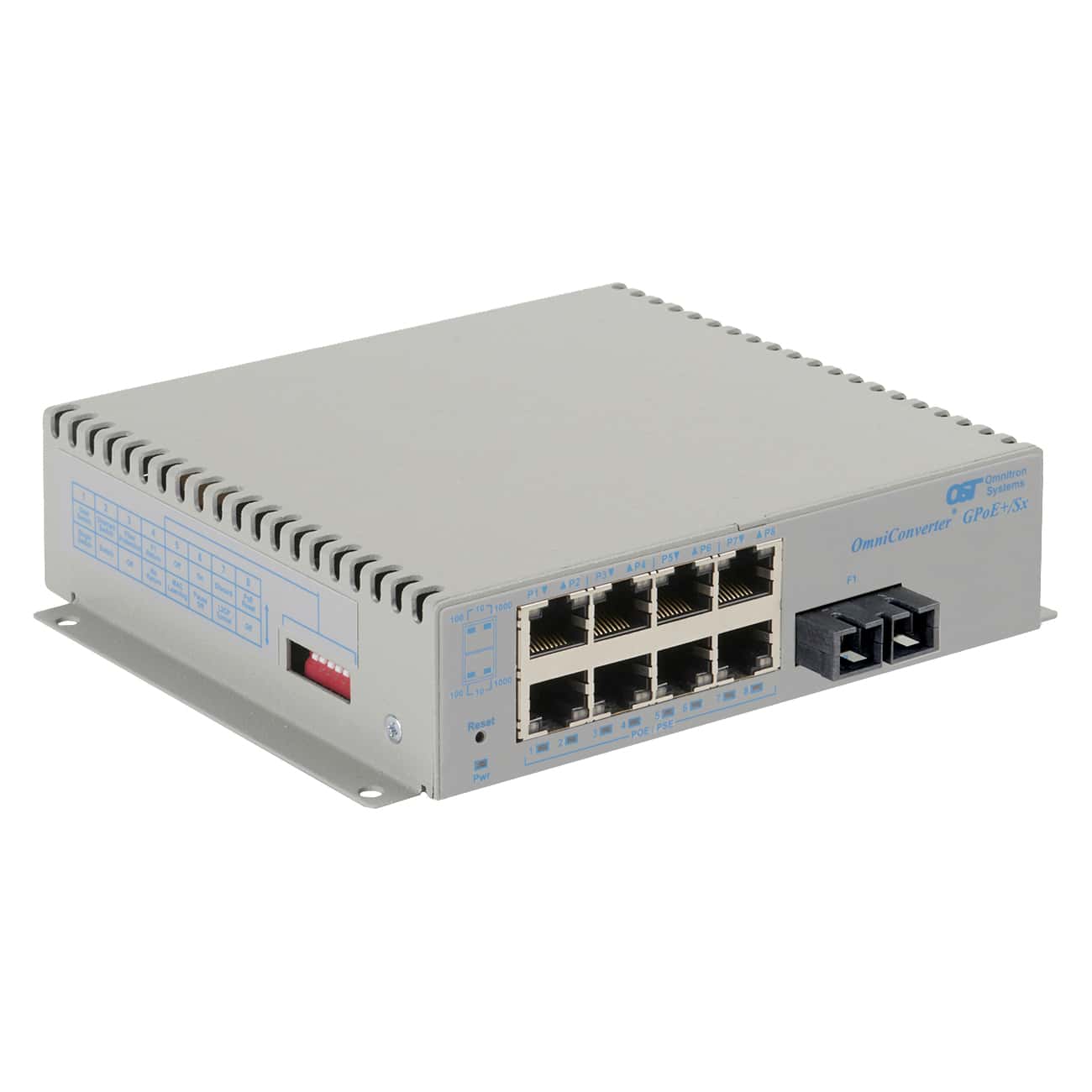 OmniConverter® GPoE+/SX: 8 x 10/100/1Gbps RJ-45 PoE+ 30W to 1 x 1 Gbps, SC, SMDF, 1550, 140km, Unmanaged Ethernet Switch, Standalone/Wall-Mount, DC 2-Pin Terminal, Wide Temperature Range