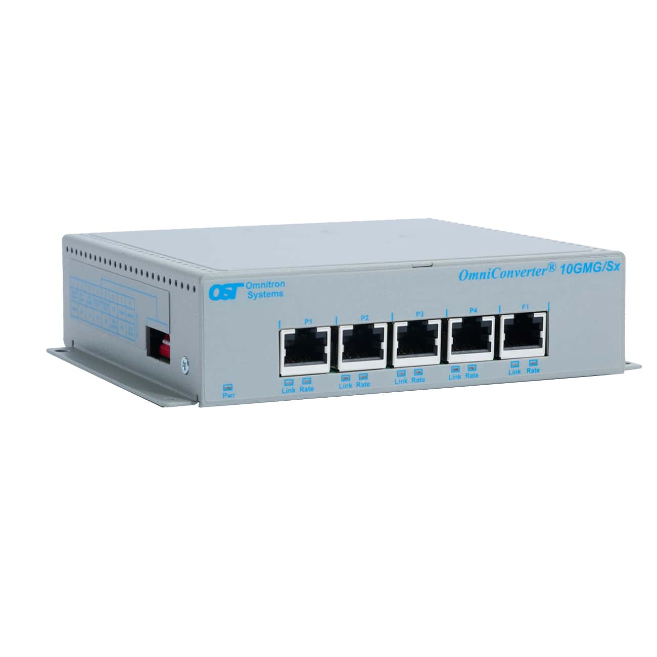 OmniConverter® 10GMG/Sx: 2 x 100M/1G/2.5G/5G/10G RJ-45 No PoE and 2 x 10/100/1Gbps RJ-45 No PoE to 1 x 100M/1G/2.5G/5G/10G Uplink, Unmanaged Ethernet Switch, Standalone/Wall-Mount, DC 2-Pin Terminal, -40 to 75°C Extended Temperature Range