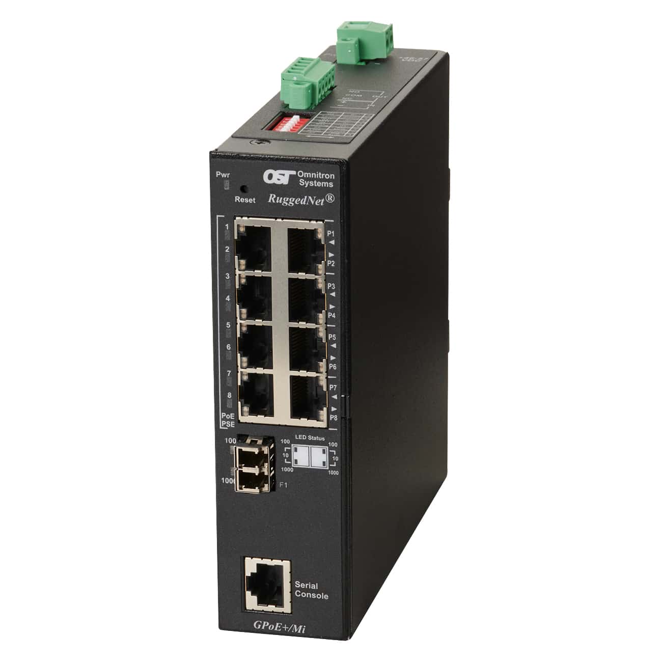 RuggedNet® GPoE+/Mi: 8 x 10/100/1Gbps RJ-45 PoE+ 30W to 1 x 1 Gbps, LC, MMDF, 850, 220/550m, Managed Ethernet Switch, DIN-Rail Mount, DC 2-Pin Terminal, Extended Temperature Range