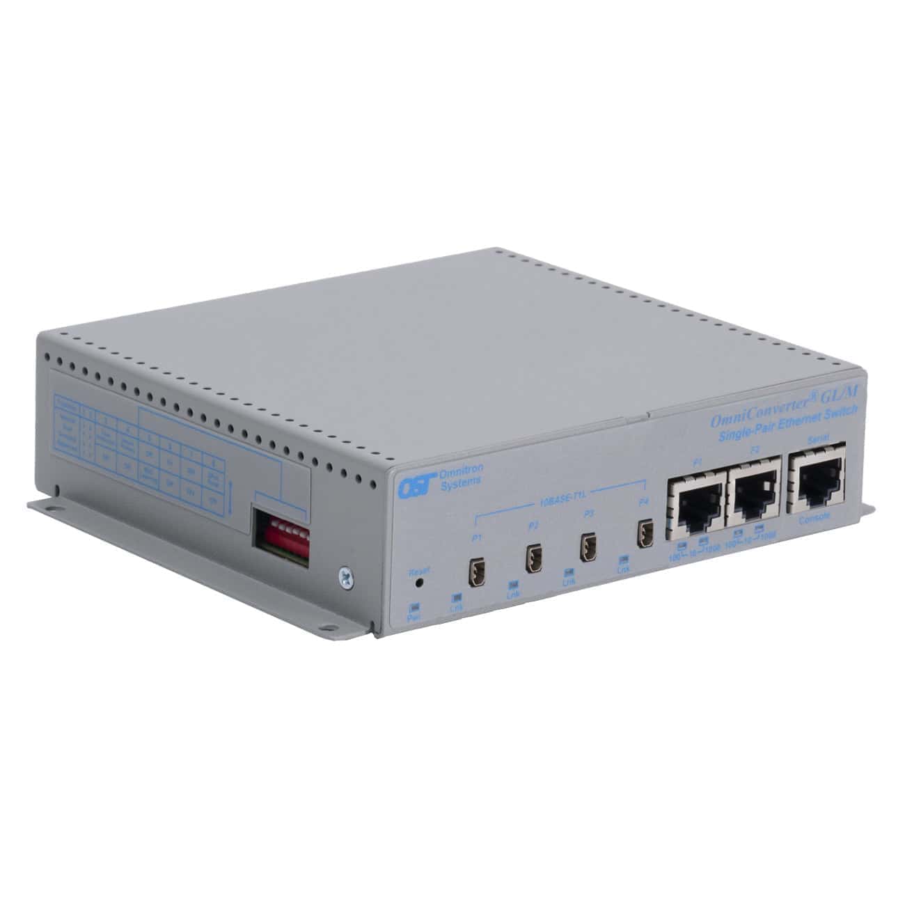 OmniConverter® SPE Managed Ethernet Switch GL/M - 2 x 10/100/1 Gbps RJ45 Uplink port, 4 x 10BASE-T1L IEC 63171-2 Connector user ports; 100-240 VAC US Pwr Adapter with US power cord; with integrated mounting brackets; Extended Temp (-40 to 75 deg C)