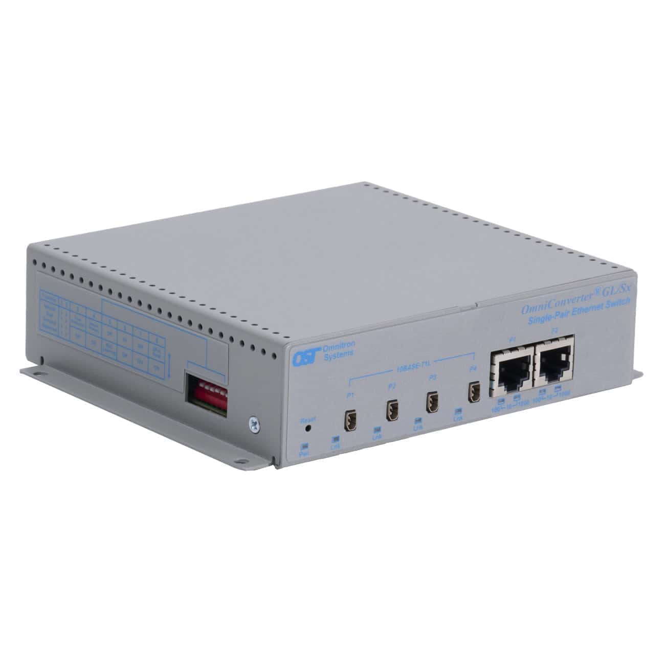 OmniConverter® SPE Ethernet Switch GL/Sx - 2 x 10/100/1 Gbps RJ45 Uplink port, 4 x 10BASE-T1L IEC 63171-2 Connector user ports; Direct DC input, 2-pin terminal connector, no power adapter, with integrated mounting brackets; Commercial Temp (0 to 50 deg C)