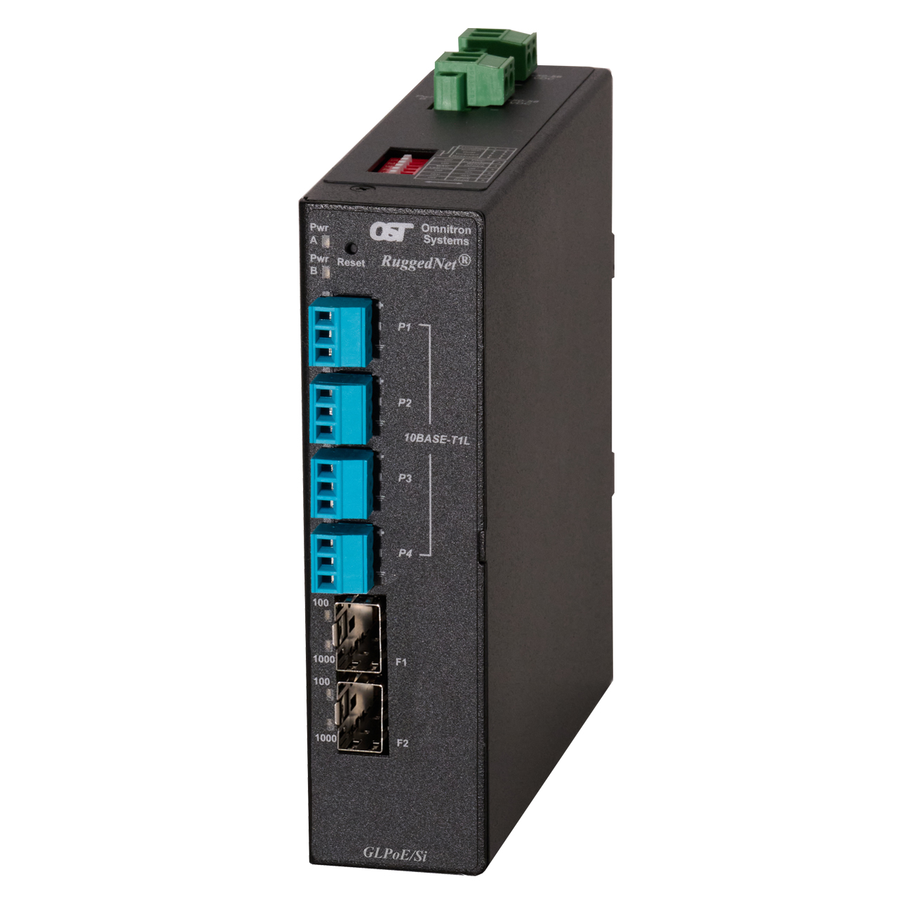RuggedNet SPoE 30/58V Ethernet Switch GLPoE/Si x - 2 x 100/1000 SFP Uplink port, 4 x 10BASE-T1L SPoE 30/58VDC 3-pin terminal connector user ports; 12 ~ 58VDC 2x2-Pin Term., Extended Temp (-40 to 75 deg C)