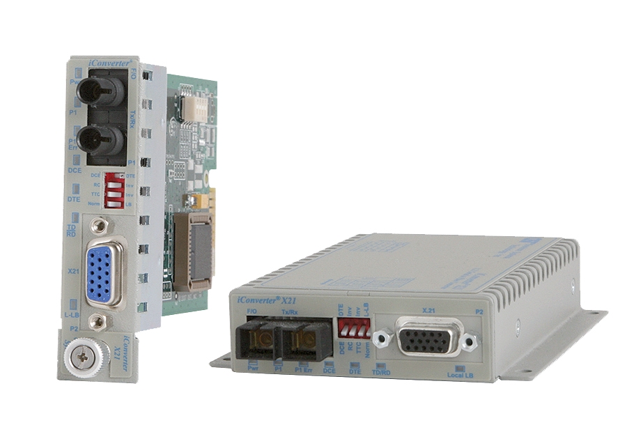 The iConverter X21 is a X.21 or RS-530 serial-to-fiber media converter, and is available as a compact, unmanaged standalone unit or a managed chassis plug-in module. The iConverter X21 supports several configuration modes to enable connections with a wide variety of X.21 and RS-530 devices.