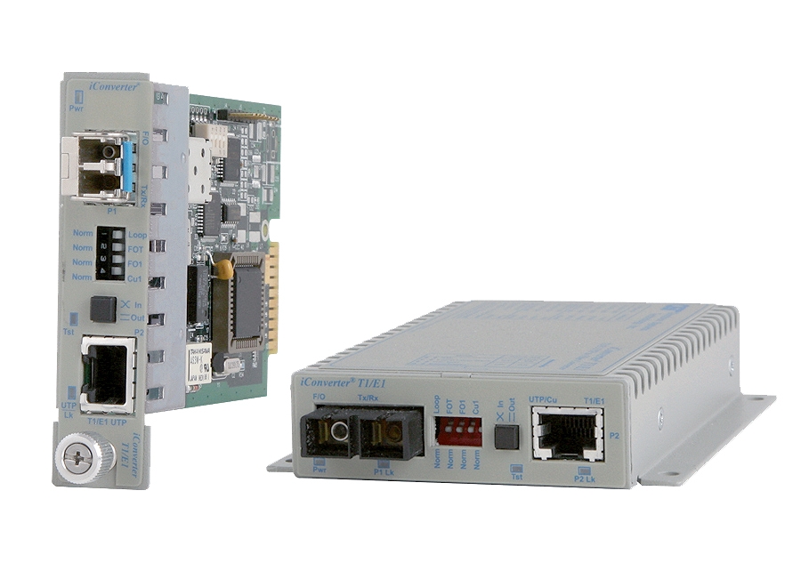 The iConverter T1/E1 is a T1 (1.544Mbps) or E1 (2.048Mbps) copper to fiber media converter, and is available as a compact unmanaged standalone unit or a managed chassis plug-in module. The iConverter T1/E1 can be used to extend the demarcation point between service provider and customer location. The iConverter T1/E1 media converters operate in pairs, extending distances over fiber.