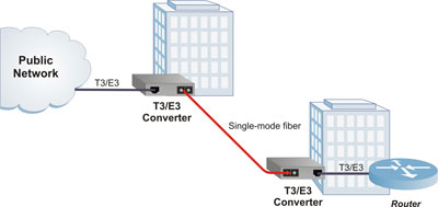 T3/E3 media converter provides a cost-effective solution for extending telecom demarcation points. A pair of T3/E3 converters is used to extend the demarcation between buildings via fiber. Multimode or single-mode fiber can be used, and fiber links can be extended up to 120km using single-mode fiber.