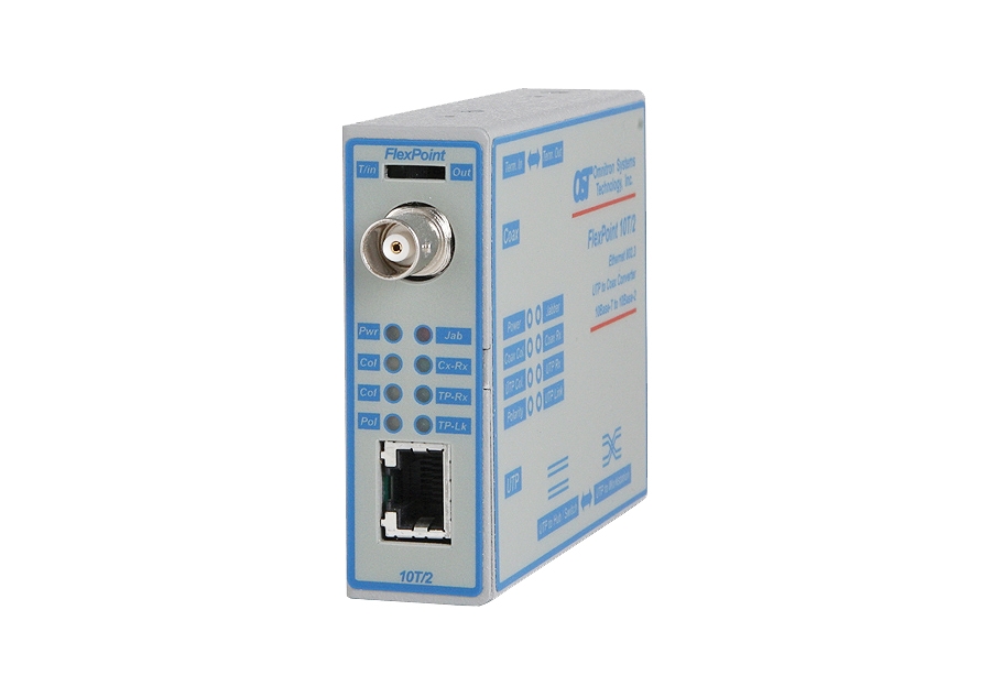 The FlexPoint 10T/2 is a Half-Duplex 10BASE-T UTP to 10BASE-2 coax media converter that facilitates the connection of a coax segment to a 10BASE-T hub or workstation.