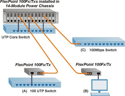 In this enterprise campus application example, FlexPoint 100Fx/Tx media converters are installed in a 14-Module Redundant Power chassis for high-density fiber distribution from UTP switch equipment at the Network Core. A UTP workgroup switch (A) is connected via fiber with a standalone FlexPoint 100Fx/Tx media converter. Another FlexPoint 100Fx/Tx converts the fiber to UTP in a fiber-to-desktop application (B). An Ethernet switch (C) is connected directly via fiber to the FlexPoint module at the Network Core. In all cases, multimode or single-mode fiber can be used, and fiber links can be extended up to 120km using single-mode fiber.
