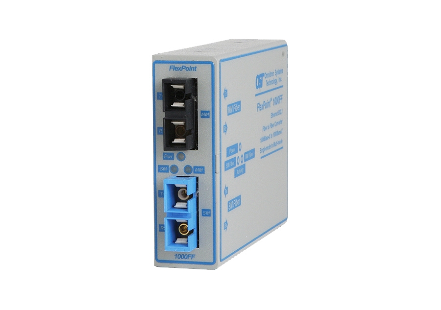 The FlexPoint 1000FF is a Gigabit Ethernet fiber-to-fiber converter/transponder that provides reliable and cost-effective extension of network distances by connecting multimode fiber networks or devices over single-mode fiber cabling.
