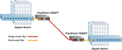 The FlexPoint 1000FF fiber converter can extend the network across single-mode fiber with distances up to 80km. In this application, two Gigabit Ethernet switches are connected utilizing a pair of FlexPoint 1000FF fiber converters, which are connected to the switches via a multimode fiber uplink.