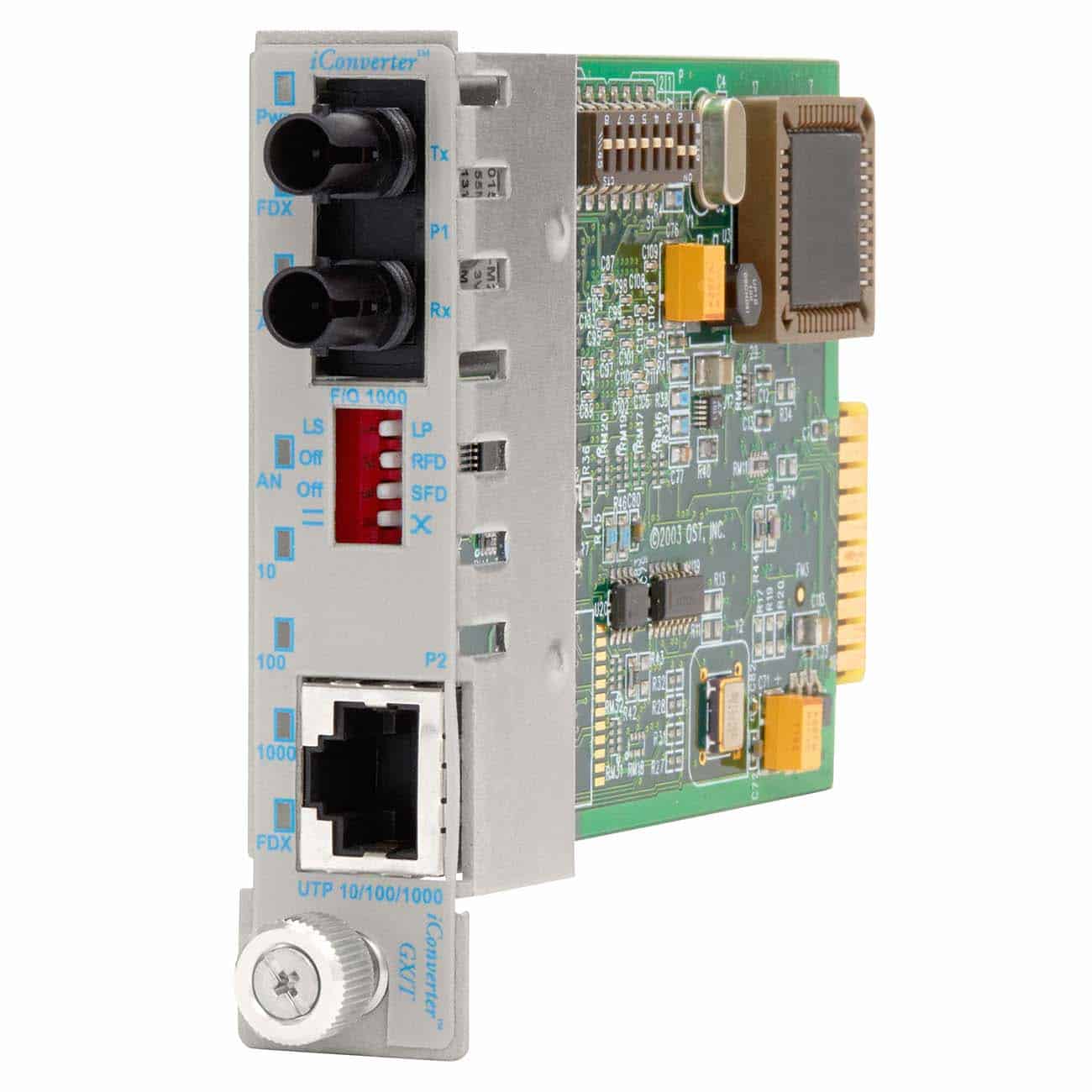 iConverter® GX/T2: 10/100/1Gbps RJ-45 to 1 Gbps, ST, Multimode Dual Fiber, 850nm, 220m, Powered by Chassis, Commercial Temperature 0 to 50 deg C