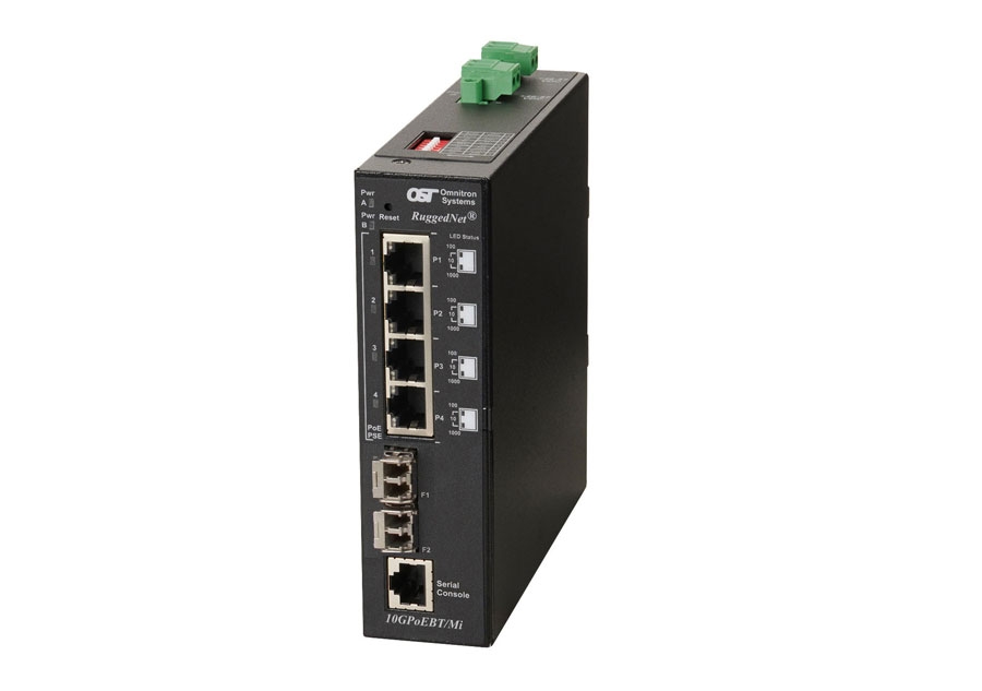 The RuggedNet 10GPoEBT/Mi is an industrial ruggedized and temperature-hardened managed Ethernet switch that features two 1/10G uplink ports and four 10/100/1000 RJ-45 IEEE 802.3bt 60W or 100W PoE user ports.