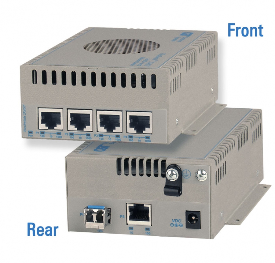 The FlexSwitch 2X4GT is a six-port Ethernet switch with four 10/100/1000 RJ-45 ports, one 10G (10GBASE-R) SFP+ or XFP fiber port, and one RJ-45 port that auto-negotiates to Gigabit or 10G (1000BASE-T/10GBASE-T). FlexSwitch 2X4GT models that support 10G SFP+ transceivers also support Gigabit transceivers for a seamless upgrade path from a Gigabit to a 10G fiber link. This compact, unmanaged switch features rate-switching and MAC learning for bridging Gigabit and 10 Gigabit Ethernet networks.